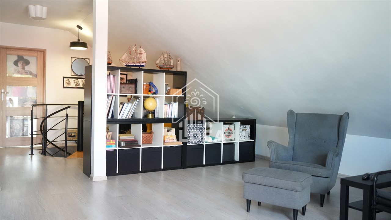 Na poddaszu znajdują się dwie sypialnie(24,7 m2; 23,9 m2) oraz łazienka wyposażona w kabinę prysznicową.