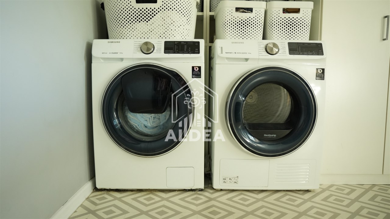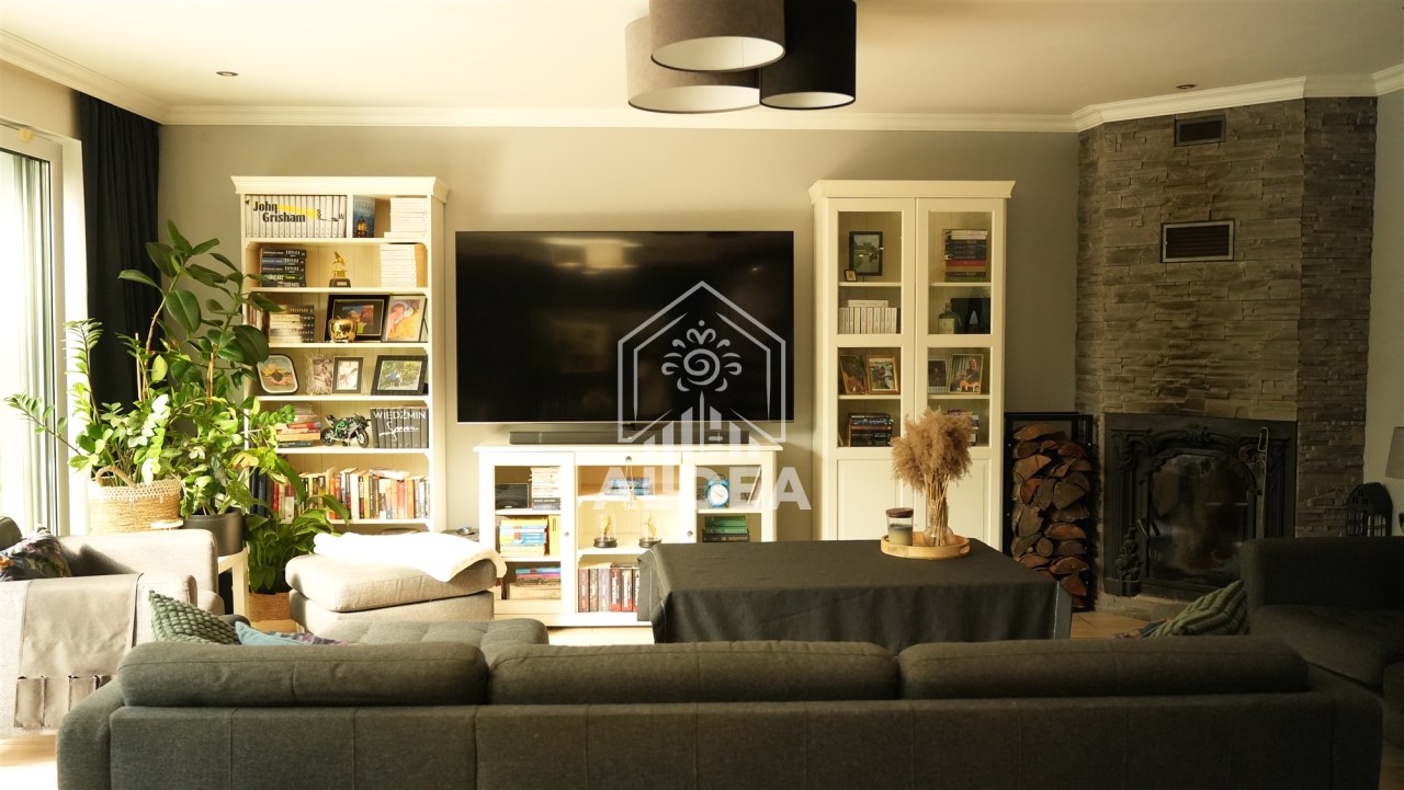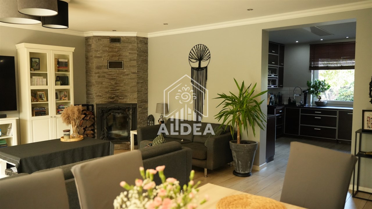 Nieruchomość obejmuje obszerny salon(36,4 m2) z dostępem do wygodnej kuchni oraz wyjściem na bardzo duży taras. Centralne usytuowanie kominka w salonie pozwala efektywnie wykorzystać jego ciepło. Na parterze znajdują się dwie sypialnie(15,3m2; 9,3 m2) przestonna łazienka(5,6m2), WC(1,5 m2) oraz pralnia(9,6 m2).